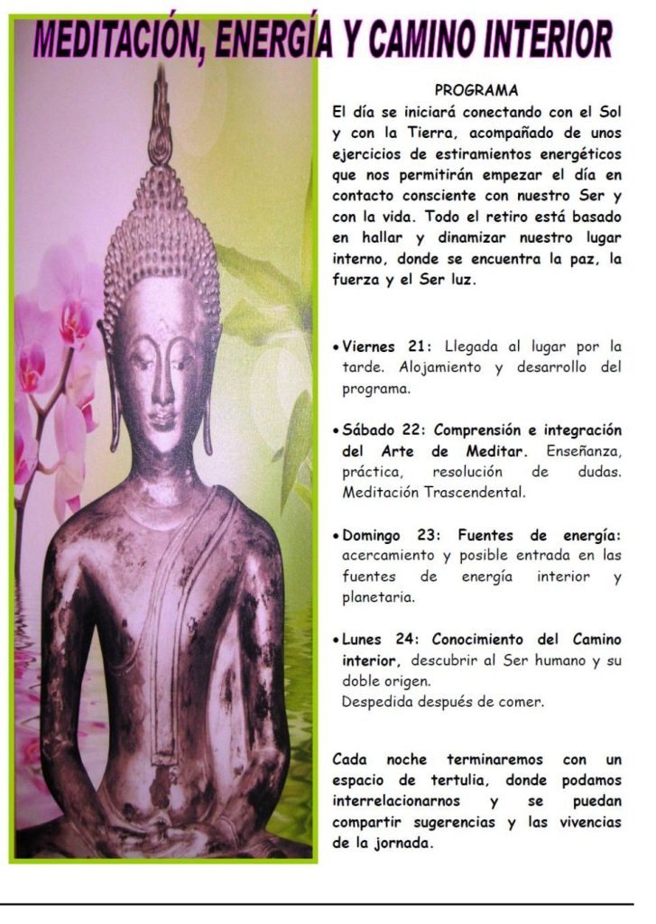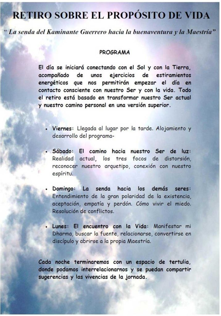 En esta sección podéis encontrar un esbozo de los retiros realizados. Sabemos que en los estados profundos del Ser el tiempo no existe como en nuestra dimensión y todo queda impreso esencialmente, sobre todo cuando las vivencias y los actos despiertan y activan las vibraciones espirituales de alta frecuencia. Por eso os invitamos a sentir. Cada cartel de los que podéis encontrar aquí es como una ventana que si se medita sobre él nos pueden acercar a experimentar la energía y el conocimiento esencial que ahí se vivió, y por ende, aún se puede vivir.